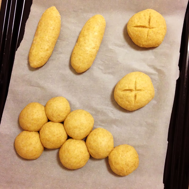 - 依喜好整形,放在烤盤上發酵 40分鐘。(在這次發酵之前我在其中兩個麵團表面用刀劃線。)